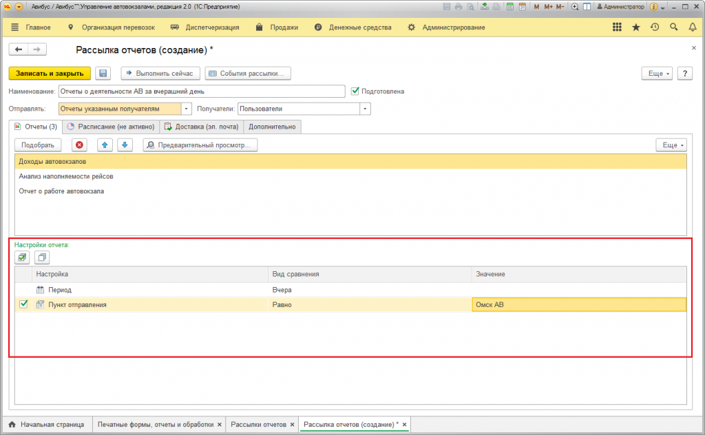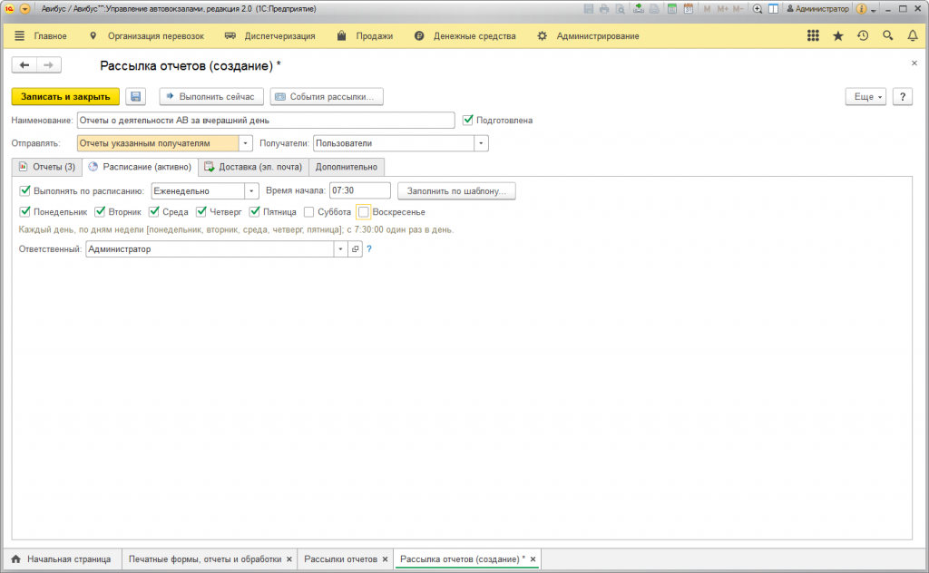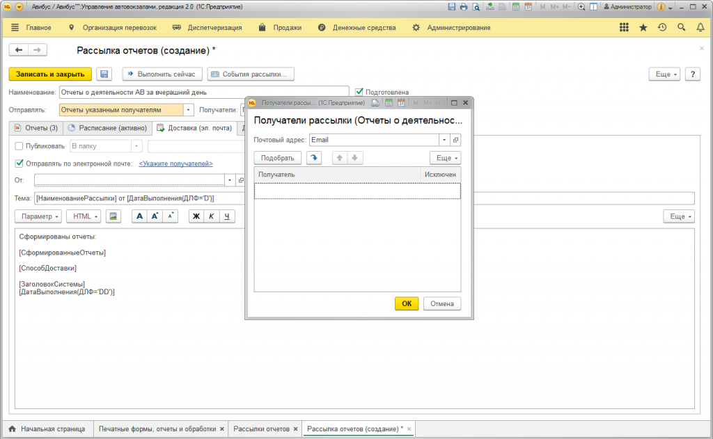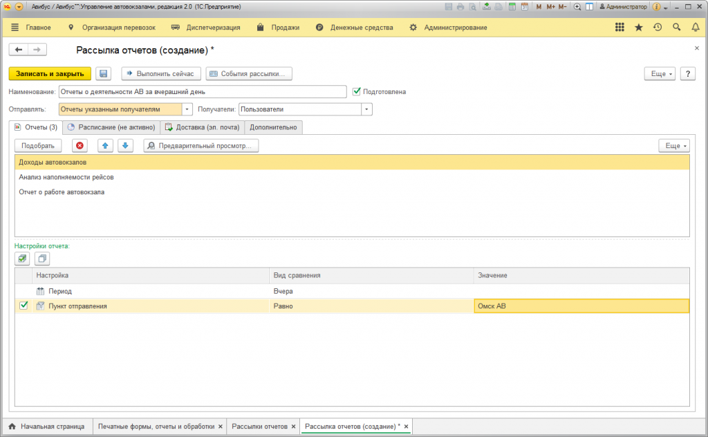 Переходим в раздел Администрирование – Печатные формы, отчеты и обработки – Рассылки отчетов – Создать.