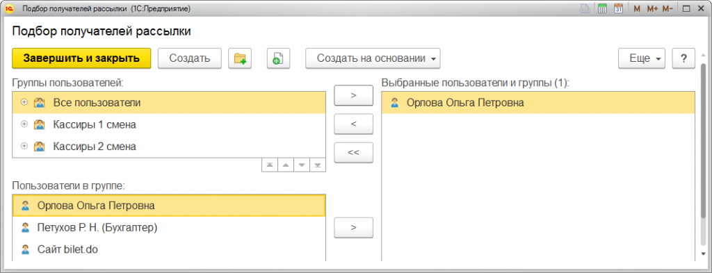 Выбираем одного, несколько независимых или группу пользователей, которые будут получать рассылку, кликаем Завершить и закрыть.