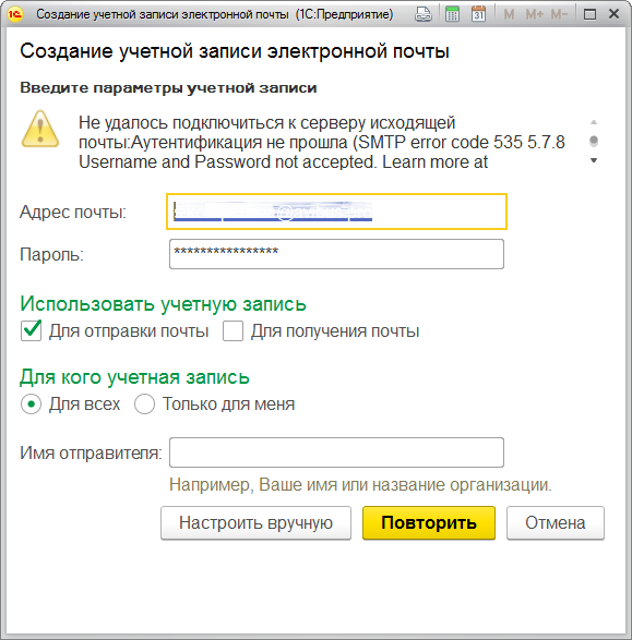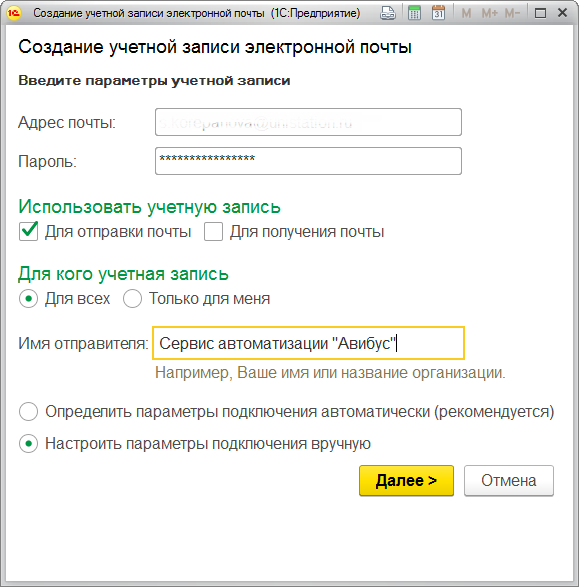Устанавливаем флаг Для отправки почты, добавляем имя отправителя (оно будет отображаться в письме), и выбираем Настроить параметры подключения вручную. КликаемДалее.