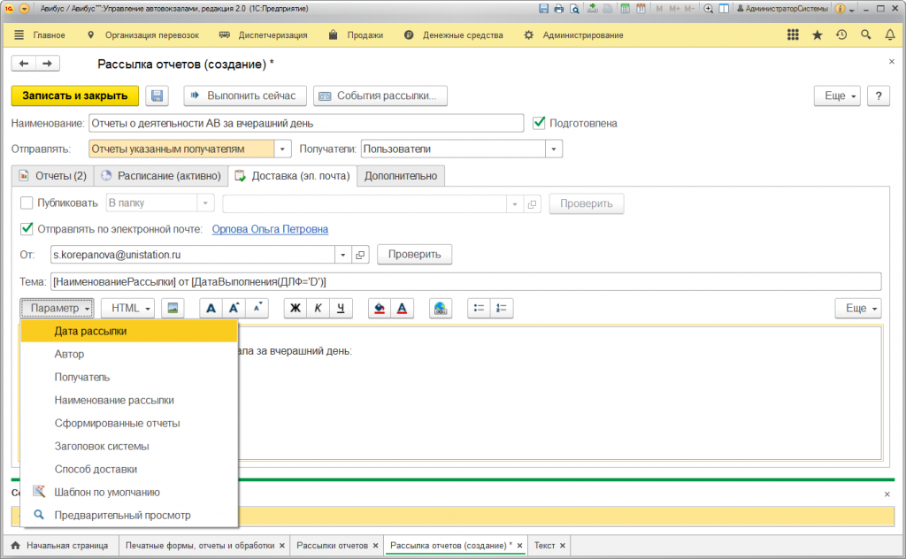 Система позволяет добавлять в текст параметры, которые будут заполняться автоматически, например, дата рассылки, наименование отчетов, автор и пр. Чтобы добавить параметр, кликаем по кнопке Параметр и выбираем из предложенных значений.