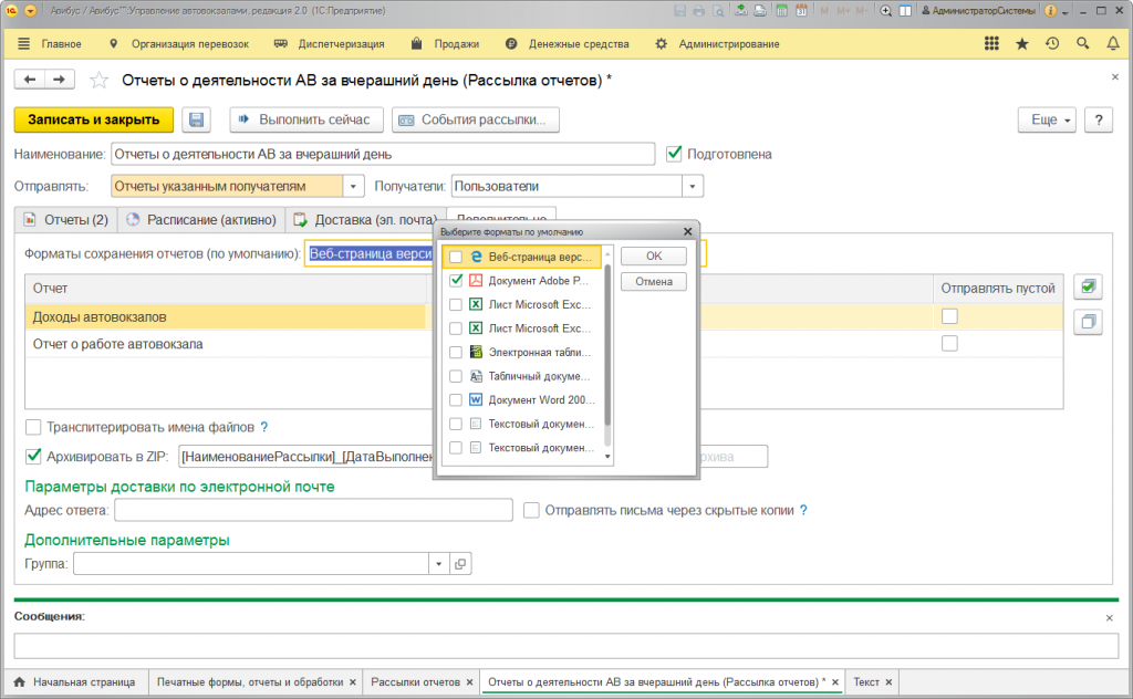 В поле Форматы сохранение отчетов (по умолчанию) выбираем удобный формат, в котором хочется получать отчеты, например, pdf, текстовый документ, таблицу Excel или любой другой из предложенных вариантов.