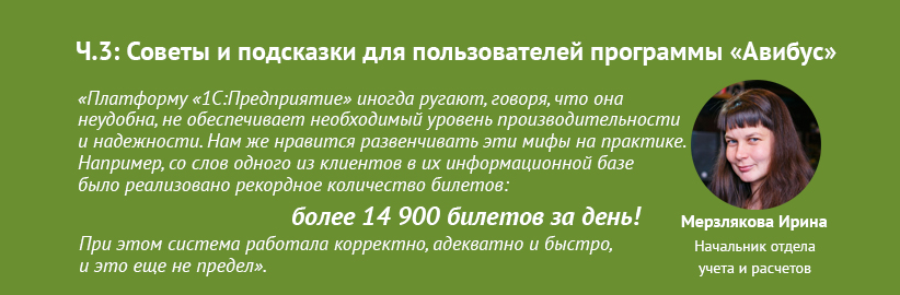 Платформу “1С:Предприятие” иногда ругают, говоря, что она неудобна, не обеспечивает необходимый уровень производительности и надежности. Нам же нравится развенчивать эти мифы на практике. Например, со слов одного из клиентов в их информационной базе было реализовано рекордное количество билетов: более 14 900 штук за день. При этом система работала корректно, адекватно и быстро, и это еще не предел.